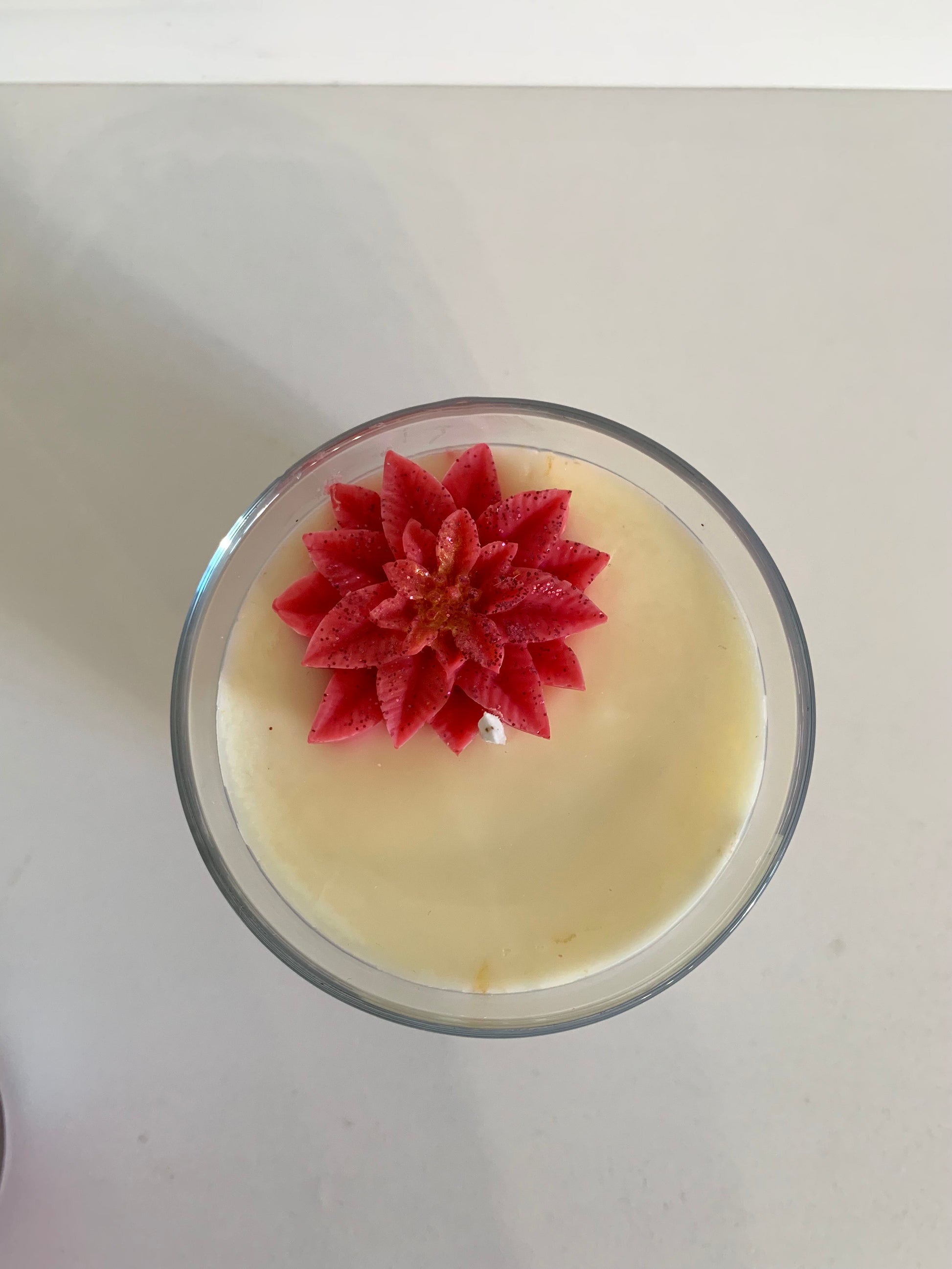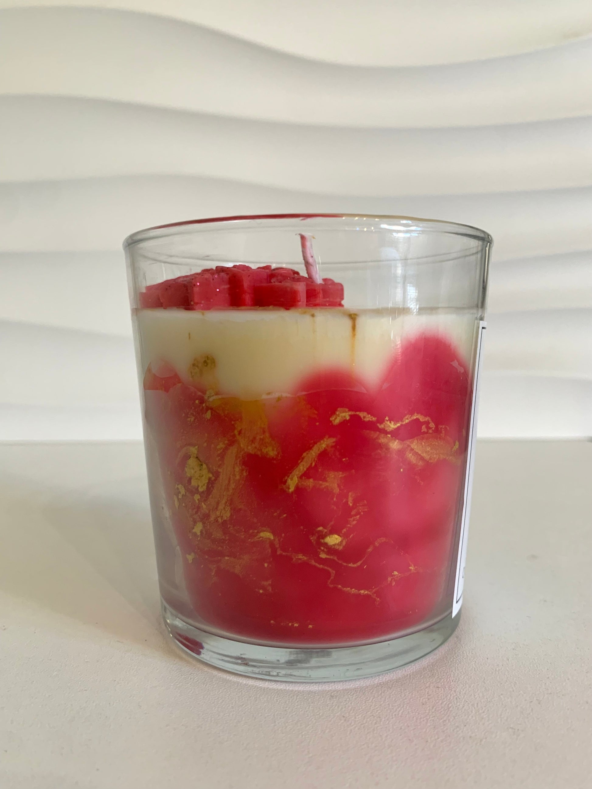 Esta vela aromática hecha a mano con cera de soja 100% vegetal, en un vaso de vidrio con marmoleado rojo y dorado, está cubierta con cera blanca y decorada en la superficie con una flor de pascua roja y dorada que la hace totalmente especial.