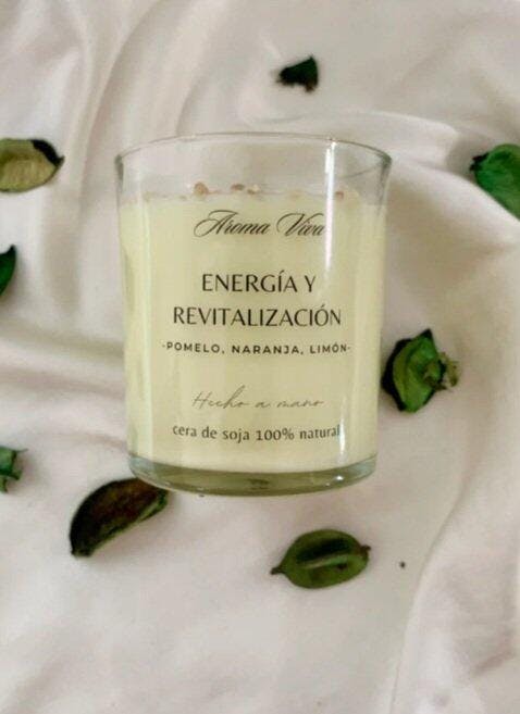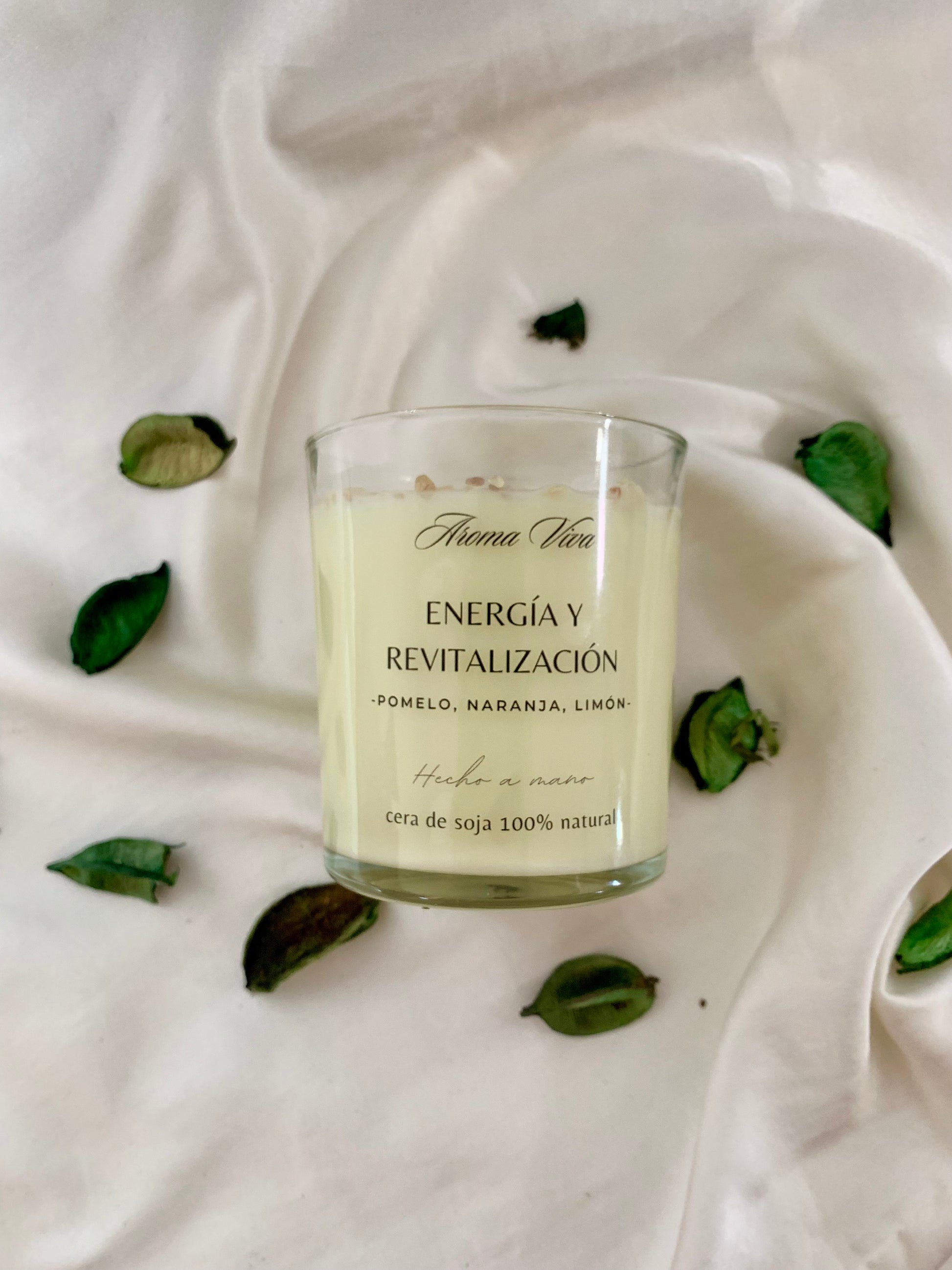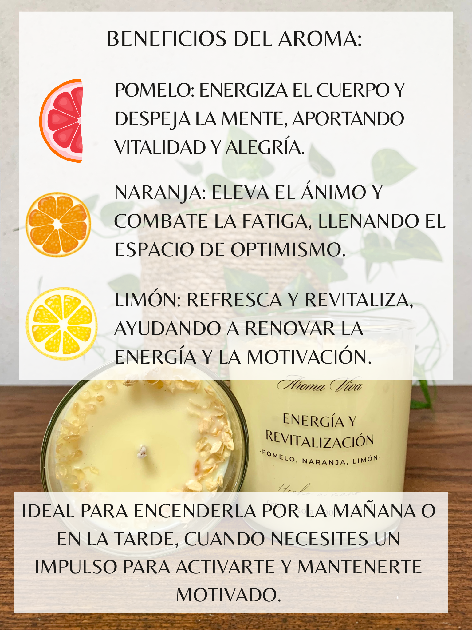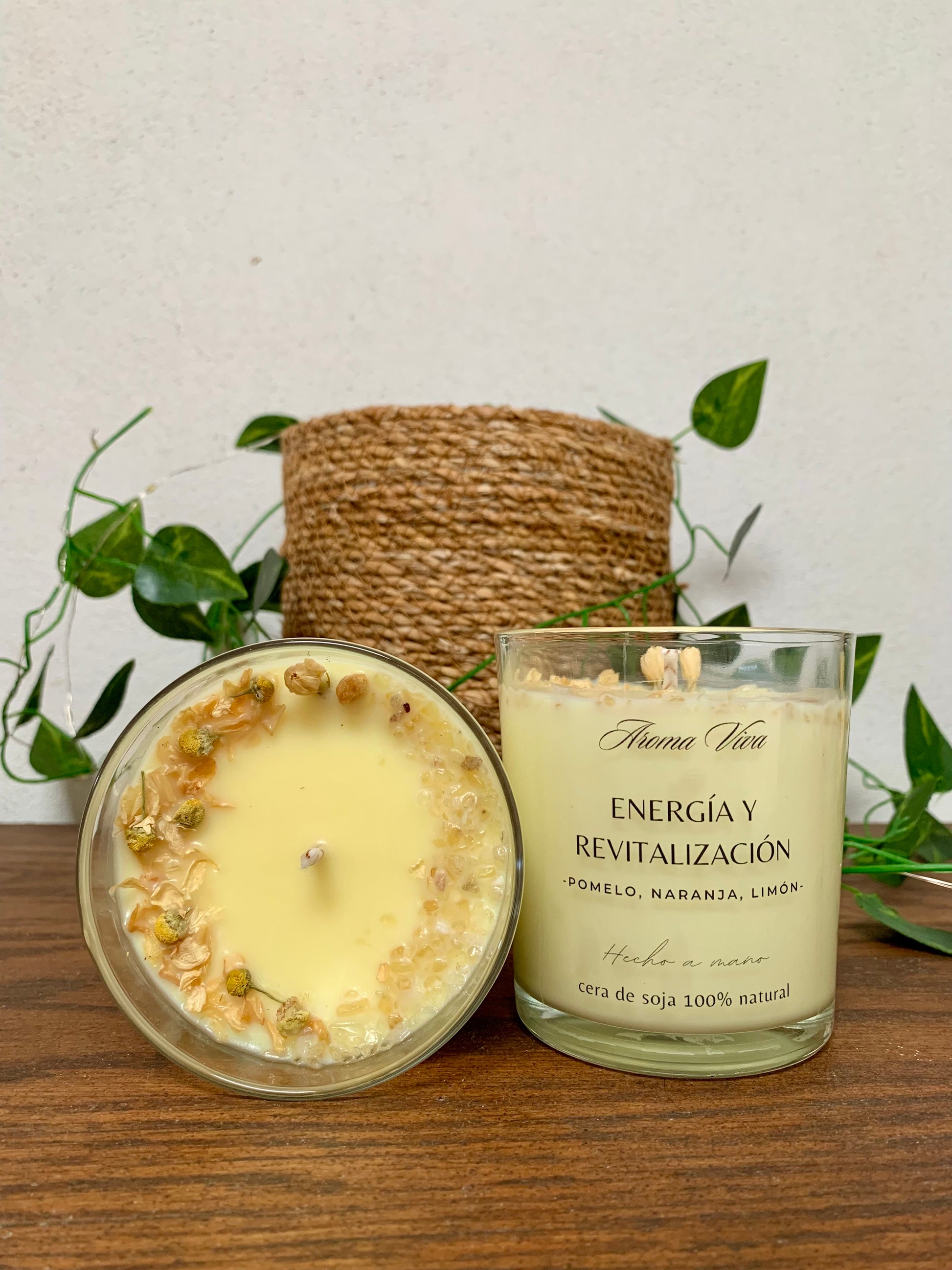 Despierta tus sentidos y eleva tu vibración con esta vela de soja aromática de pomelo, naranja y limón. Su aroma cítrico y alegre te llena de energía positiva y claridad mental. Decorada con citrino, pétalos de jazmín y brotes manzanilla, irradia vitalidad y optimismo. ☀️